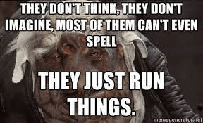 In this context common people are reduced to cogs that must make the social machinery operate, without disturbing the established order. There is clear separation between the order-givers (political and business elites) and the order-takers (the rest of society). The creative potential of the great majority is sacrificed in the daily hustle for survival in a world where societies are broken into individuals that compete with each other, rather than cooperate. This situation only works for the benefit of the ruling classes, i.e. those that get to call the shots.